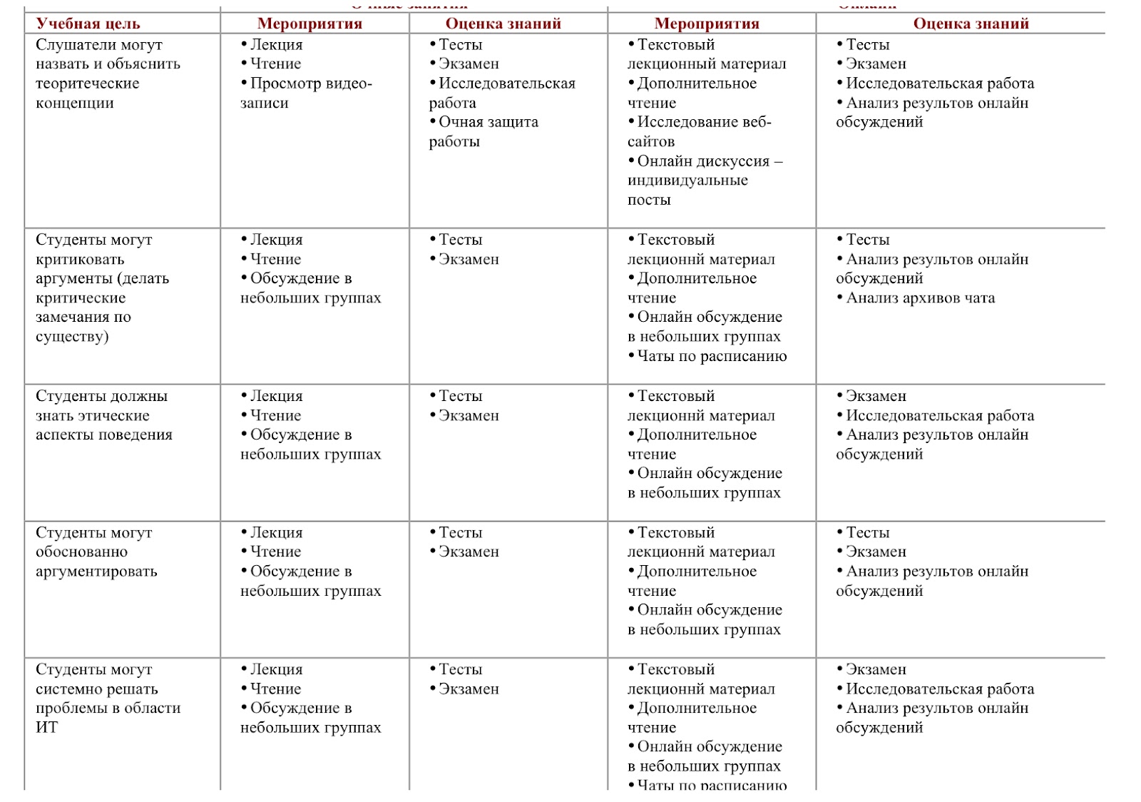 В одной книге случайно наткнулась на то, как преподаватель планировал перевод своего курса из очного режима в онлайн. Картинка у меня не очень получилась, поэтому комментирую - первые два столбца после целей это очное, потом два - преобразование для онлайн обучения.